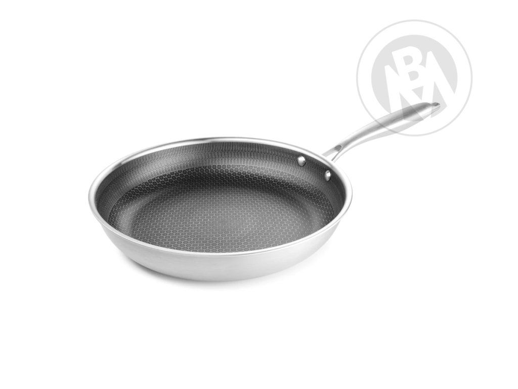 Nerezová ocel, nepřilnavý voštinový povrch, hmotnost 880 g. Vhodná pro plyn, keramiku, elektřinu i indukci.